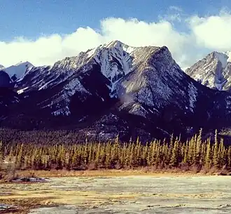 Esplanade Mountain is a 2,301-metre (7,549-foot) mountain summit located in Jasper National Park, in the Canadian Rockies of Alberta, Canada. The peak is situated 20 kilometres north of the municipality of Jasper, in the Athabasca Valley and is visible from Highway 16 and the Canadian. Its nearest higher peak is Cliff Mountain, 5.0 km (3.1 mi) to the west.[1] Esplanade Mountain was named in 1916 by Morrison P. Bridgland for its long, flat top resembling an esplanade.[3][4] Bridgland (1878-1948) was a Dominion Land Surveyor who named many peaks in Jasper Park and the Canadian Rockies.[5] The mountain's name was officially adopted in 1956 by the Geographical Names Board of Canada.[2]