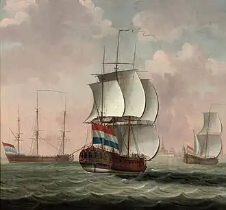 Merchants from Zeeland accounted for 152 voyages between 1771 and 1789. The first two financial years, Essequebo Society paid 3% dividend and retained 4,500 guilders in cash. After that year, losses were reported until 1778. After 1779 profits were again made.[5] After the Fourth Anglo-Dutch War broke out, four ships were captured by the British: Eensgezindheid, Jonge Juffrouw Margaretha, Middelburgsche Hoop and Vryheid.[6] The financial situation of the society deteriorated. In 1788 it was decided to liquidate. The debt was paid off by selling ships, so that the organization continued to exist for some time.[7]