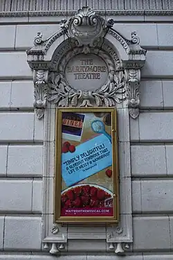 On either side of the doors are terracotta niches with bronze-framed sign boards. Above the signboards are terracotta wreaths, which surround circular panels with the gilded letters "The Barrymore Theater". Each wreath is topped by a curved pediment. The western and eastern portions of the facade are recessed slightly and contain recessed openings.[15] The opening to the east is marked as the stage door.[10][15] A frieze, decorated with leaf and wave moldings, runs above the first floor.[15] To the east, there was originally a stage house with fire escapes on its facade, but this has since been replaced with the Morgan Stanley Building.[17]