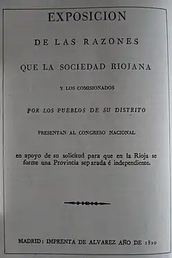 - ^ Viguera Ruiz, Rebeca (2012). "3.1 Acuerdo institucional para solicitar la erección de La Rioja como intendencia". La Convención de Santa Coloma de 1812. Historia de una reivindicación liberal de la identidad riojana (in Spanish). Instituto de Estudios Riojanos. pp. 82–85. ISBN 978-84-9960-041-3.