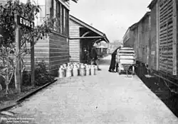 Cream cans standing on the platform of the Eudlo railway station, 1932