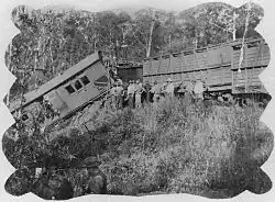 In 1931, a wagon carrying petrol was derailed.[6] In 1933, there was a head-on collision of the Townsville Express (a passenger train) and a goods train, derailing the parlour car and the sleeping cars of the passenger train.[7][8][9]
