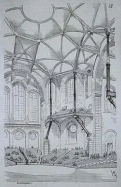 The task was all the more difficult because up until that time no scientific studies had been made of medieval building techniques, and there were no schools of restoration. He had no plans for the original building to work from. Viollet-le-Duc had to discover the flaws of construction that had caused the building to start to collapse in the first place and to construct a more solid and stable structure. He lightened the roof and built new arches to stabilize the structure, and slightly changed the shape of the vaults and arches. He was criticized for these modifications in the 1960s, though, as his defenders pointed out, without them the roof would have collapsed under its own weight.[10] Mérimée's deputy, Lenormant, inspected the construction and reported to Mérimée: "The young Leduc seems entirely worthy of your confidence. He needed a magnificent audacity to take charge of such a desperate enterprise; it's certain that he arrived just in time, and if we had waited only ten years the church would have been a pile of stones."[11] This restoration work lasted 19 years.