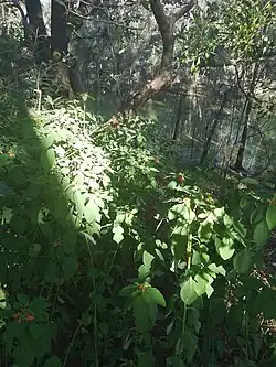 Euphorbia Cyathophora growing invasively in a Queensland forest.