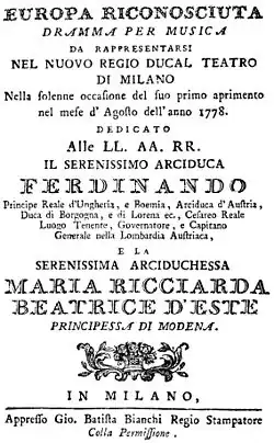 Europa riconosciuta (Italian: [euˈrɔːpa rikonoʃˈʃuːta]; meaning "Europa revealed" or "Europa recognized") is an opera in two acts by Antonio Salieri, designated as a dramma per musica, set to an Italian libretto by Mattia Verazi.