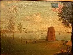 The British Fort George at Bowling Green was also demolished in 1790, and in that year the "Battery Flagstaff" was built adjacent on newly reclaimed land at the Battery. It was privately managed by William and then Lois Keefe. Referred to colloquially as "the churn", as it resembled to some a gigantic butter churn, Washington Irving described a September 1804 visit to the commemorative flagpole in his A History of New York as "The standard of our city, reserved, like a choice handkerchief, for days of gala, hung motionless on the flag-staff, which forms the handle to a gigantic churn".[47] In 1809, a new flagstaff further east on the Battery was erected with a decorative gazebo, and was operated as a concession until it was demolished about 1825.[48][49][50][51][52] The military band led by Patrick Moffat of George Izard's Second Regiment of Artillery sometimes held evening concerts.[53] The Battery Flagstaff commemorated Evacuation Day, and was the site of the city's annual flag-raising celebration for over a century. A flag-raising was held twice a year, on Evacuation Day and on the Fourth of July, and after 1853 flag-raisings on these days were also held at The Blockhouse further north.[54][55][56] John Van Arsdale is said to have been a regular flag-raiser at the early commemorations.[56]