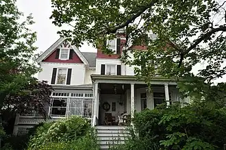 The Everett Wallace House stands in the southern part of the village center of Milbridge, on the west side of US 1 just north of its junction with Wyman Road. It is set on a lot fronted by a picket fence along with a two-car detached garage. The house is a 2+1⁄2-story wood-frame structure, with asymmetrical styling typical of the Queen Anne period. It has a steeply pitched gabled roof, a brick foundation, and an exterior clad in a variety of finishes, including wooden shingles, aluminum siding, and applied Stick style half timbering. It is roughly L-shaped, its shape somewhat obscured by single-story porches along the front, one of which has been enclosed in glass. Its front is in three sections, with a central three-story tower flanked by a projecting gabled section on the right and a recessed one on the left.[2]