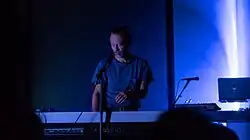 Yorke performed "stripped-back" arrangements of songs from his solo records and his bands Radiohead, Atoms for Peace and the Smile.[5] He also debuted the song "Back in the Game", created with the English electronic musician Mark Pritchard for the album Tall Tales, released the following year.[6][7] Yorke used a variety of synthesisers, guitars, mixers and microphones, moving between them as he played.[2][8]
