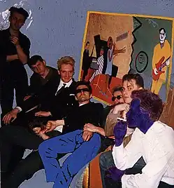 Oleg Kotelnikov, Inal Savchenkov, Georgy Gurianov, Timur Novikov, Sergei Bugaev, Igor Verichev, Valery Alakhov (from L-R). Photograph: (E-E) Evgenij Kozlov, 1980s, coloured by Georgy Gurianov.