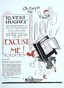 Excuse Me is a 1925 American silent comedy film starring Norma Shearer and Conrad Nagel. It was directed by Alfred J. Goulding, and based on the 1911 play of the same name written by best-selling novelist Rupert Hughes.[1][2] The comedy concerns naval officer Harry Mallory and his would-be bride Marjorie Newton who spend most of their time running up and down a train looking for a clergyman to marry them.