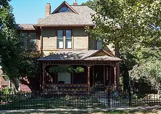 The F.A. Benham House, also known as the Stoner House and the Barquist House, is a historic building located in Des Moines, Iowa, United States. Built in 1884, the two-story structure features wood-frame construction, a brick foundation, and decorative details that were influenced by the Stick Style of architecture. Its significance is found in its late Victorian design that is exemplified in the Eastlake style.[2] It can be seen in the building's massing, roof's steep pitch, and front porch's spindlework. The house was listed on the National Register of Historic Places in 1998.[1] The house shares the historic designation with the frame barn (c. 1900) and the Victorian cast iron fence and gate that runs in front of the house.