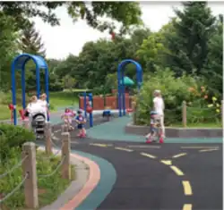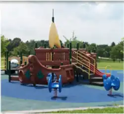 In 1999, Hadley's Park opened with a castle, a frontier village and a pirate ship. Rather than using gravel or woodchips, Hadley's Park had a rubber-based surface covering 34,000 square feet (3,200 m2) of playing surface.[5] This is one of the largest pour-in-place playing surfaces in the world.[5] The surface is durable enough for wheelchairs and walkers, yet soft enough not to hurt a child if they fall. The incorporation of high edge curbs, bright colors and braille signage supports visually-impaired children.[5]