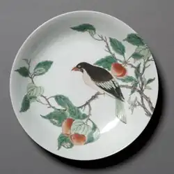 Famille jaune, noire, rose, verte are terms used in the West to classify Chinese porcelain of the Qing dynasty by the dominant colour of its enamel palette. These wares were initially grouped under the French names of famille verte ("green family"), and famille rose (pink family) by Albert Jacquemart in 1862. The other terms famille jaune (yellow) and famille noire (black) may have been introduced later by dealers or collectors and they are generally considered subcategories of famille verte.[1][2] Famille verte porcelain was produced mainly during the Kangxi era, while famille rose porcelain was popular in the 18th and 19th century. Much of the Chinese production was Jingdezhen porcelain, and a large proportion were made for export to the West, but some of the finest were made for the Imperial court.