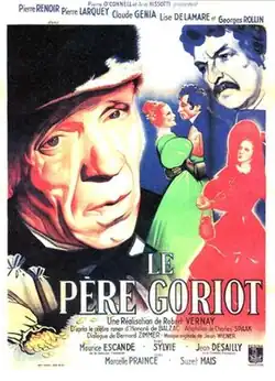 Father Goriot (French: Le père Goriot) is a 1945 French historical drama film directed by Robert Vernay and starring Pierre Renoir, Claude Génia and Lise Delamare.[1] It is an adaptation of the 1835 novel of the same title by Honoré de Balzac. It was shot in 1944 but not released until the following year.[2] The film was shot at the Cité Elgé in Paris. The film's sets were designed by the art director René Renoux.