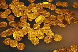 The Fatimids followed the usual Islamic pattern of gold dinars and silver dirhams, along with fractions and multiples thereof.[8] Copper or bronze coins survive, but they were likely not issued as the standard fals, but rather as fractions of the dirham.[9] From the coins surviving to the present, the most frequent ones are full dinars and half-dirhams, although there are regional variations.[8] For example, in Sicily, the quarter-dinar—introduced by the Aghlabids, it remained the island's standard gold coin even after the Fatimid period as the tarì[10]—is by far the most common issue, while the half-dirham is almost non-existent.[11] Given the lack of copper coinage and the neglect of silver coinage by modern collectors, modern studies on Fatimid coinage primarily focus on the Fatimid gold dinars.[12][13]