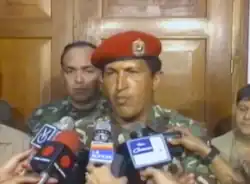 The betrayals, defections, errors, and other unforeseen circumstances left Chávez and only a small group of rebels completely cut off in the Military Museum, without any means of conveying orders to their collaborators.[19] Nevertheless, rebel forces in other parts of Venezuela made swift advances and took control of such large cities as Valencia, Maracaibo, and Maracay with the help of spontaneous civilian aid. Chávez's forces, however, had failed to take Caracas since he remained inside the Military Museum.[20] Chávez soon gave himself up to the government. He was then allowed to appear on national television to call for all remaining rebel detachments in Venezuela to cease hostilities. When he did so, Chávez famously quipped on national television that he had only failed "por ahora" ("for now"):[21]
