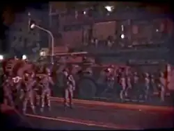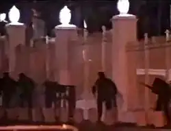 The final attempt in the coup attempt occurred 30 minutes later at Miraflores Palace where insurgents attempted to siege the palace and kill President Pérez.[15] Those attempting to attack Miraflores were told that the doors would be opened by the palace guards that were supposedly part of the coup.[15] However, when the attackers approached Miraflores in an armored vehicle, they were attacked by the palace guards who knew about the coup.[15] The firefight then ended Chávez's attack and left 3 of Pérez's bodyguards dead while Pérez hid under an overcoat eluding capture.[5][18] The president was then able to escape from the palace and then called General Ochoa saying, "No negotiations. Give them bullets. I want to be back in soon".[5][18] Pérez then used a local TV station to rally the rest of the military against his aggressors.[5] Chávez's allies were also unable to broadcast Chávez's pre-recorded call for a planned mass civilian uprising against Pérez.
