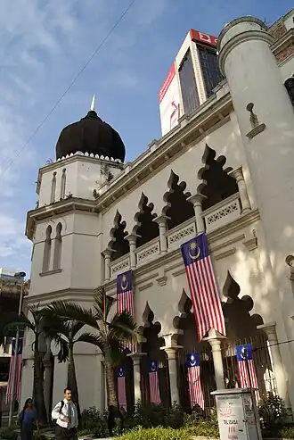 Hubback's Indo-Saracenic design was similar to other buildings which he had previously designed in Kuala Lumpur such as the nearby former Municipal Office and Town Hall and Jamek Mosque. Its facade features a 400 foot long colonnade on both floors with distinctive 'cinquefoil' (five-leafed clover) arches, terminated at each end by two 80 foot high octagonal towers surmounted by onion shaped domes of copper.[6]