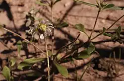Felicia bergeriana is an annual, moderately sturdy, upright herbaceous plant of up to 25 cm (10 in) high that branches regularly towards the top. Its stems are covered in perpendicular bristles and glands. The leaves are all oppositely arranged on the stems, lance-, ellipse-, spoon- or inverted lance-shaped, up to 31⁄2 cm (1.4 in) long and 0.6–1 cm (0.24–0.39 in) wide, entire or with some short teeth, without or with an indistinct stalk and covered in long hairs.[3]