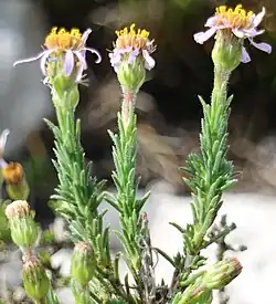 Felicia canaliculata is a grayish green shrublet in the family Asteraceae that grows up to 40 cm (16 in) in height. It has narrow, awl-shaped leaves, relatively large flower heads with approximately a dozen light purple to white ray florets encircling many yellow disc florets. It can only be found in the Western Cape province of South Africa.[2]