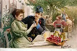 Myrbach visited America on a state-funded study trip in 1904, part of which was to represent the Applied Arts School at the 1904 World's Fair in St Louis;[17] from California, he submitted his resignation to the school due to ill health.[1][18] He moved abroad in 1905, first returning to Paris and providing illustrations for Hachette, and then from 1914 living in Spain, mainly in Barcelona but also spent time in Bilbao. He returned to Austria in 1936.[19]