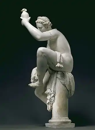Avery suggests a now lost ancient Roman figure of a Bathing Venus as a possible source, one he identifies in a drawing showing three points of view, made by Maarten van Heemskerck during a visit to Rome around 1535. In this lost work, the figure stands on her right leg, and is largely supported by her left buttock which rests on a pedestal. Similar to Giambologna's figure, this woman also bends forward to clean her left leg.[12] Other sources might have been Raphael's Psyche being carried by Cupid (1517–18, Rome, Villa Farnesina) and Michelangelo's Ignudi (Rome, Vatican, Sistine Chapel, 1508–12).[13] A red wax model attributed to Giambologna (private collection), which is missing its limbs and head, and slumps backwards, is close in pose to the Getty-statue, especially in the left shoulder and angle of the neck.[14]