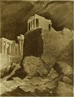Greece, Italy, Egypt and California are the lands from which the artist has taken his scenes--These pictures are all new most of them being the product of a recent trip about the world--this present exhibition some of the finest work--and it is very fine at its best--are the pictures of Greece, especially The Temple of Nike.[28]