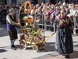 On the morning of 13 October, the Offering of Fruits takes place. This tradition, akin to a harvest festival, first took place in 1949, and was a precursor to the offering of Flowers. A parade takes place with a similar route to that of the Offering of Flowers, in which people bring to the Virgin a variety of fruits, primarily produce from the region of Aragon, as well as other regions in the country.