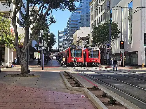 It is one of the original stations of the San Diego Trolley, opening on July 26, 1981. At the time of opening, it was called Gaslamp station, due to its proximity to the Gaslamp Quarter.[5] During the development of the Bayside extension, which would include a station much closer to the Gaslamp Quarter, this station was often called Gaslamp North station, while the new station was called Gaslamp South.[6] When the Bayside extension opened in 1990, the new stop was called Gaslamp Quarter station, and this station was renamed Fifth Avenue to avoid confusion.