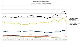 The net worth of the United States and its economic sectors has remained relatively consistent over time. The total net worth of the United States remained between 4.5 and 6 times GDP from 1960 until the 2000s, when it rose as high as 6.64 times GDP in 2006, principally due to an increase in the net worth of US households in the midst of the United States housing bubble. The net worth of the United States sharply declined to 5.2 times GDP by the end of 2008 due to declines in the values of US corporate equities and real estate in the wake of the subprime mortgage crisis and the 2008 financial crisis. Between 2008 and 2009, the net worth of US households had recovered from a low of 3.55 times GDP to 3.75 times GDP, while nonfinancial business fell from 1.37 times GDP to 1.22 times GDP.[5]