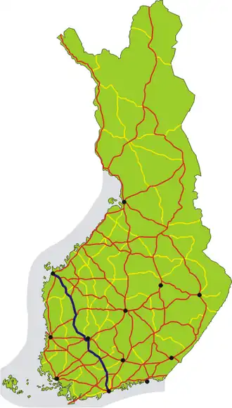 To the south of Tampere city center, Highway 3 turns onto Tampere's western ring road, which is also a motorway. The western ring road was completed as a two-lane road, partly as a two-lane expressway in 1985.[6] The motorway ends slightly west of the center of Ylöjärvi, and the highway turns from the ring road at the Elovainio interchange to the road between Tampere and Vaasa. Between Ylöjärvi and Vaasa, Highway 3 is a standard Finnish two-lane highway, the quality of which varies. Some of the major interfaces have been upgraded to intermodal interfaces. In addition, there is an 11-kilometre-long motorway between Korsholm's Helsingby and Vaasa. The road ends in the center of Vaasa.[7] The motorway is partially shared with Finnish national road 8, which joins the line of road 3 in Helsingby, before branching off in Liisanlehto to a bypass road.