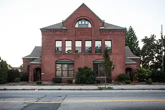 Fire Station Number 4, also known as the Collyer Fire Station, (see building plaque) [2] was constructed in 1887-1888 by H. L. Bassett & Co. and F. L. Mason on the southwest corner of Broadway and Carnation Street, in the center of Pleasant View neighborhood. The building was completed and named in 1890. The main block of the Queen Anne-styled red brick firehouse is a 2+1⁄2-story, hip-roofed rectangle with a cross-gable facing Broadway. A pair of matching single-story wings with gable-on-hipped roofs project from the long sides of the building. The building has small hip-roofed porches with arched openings on the main entrance and Broadway facing sides. Though constructed of red brick and pinkish mortar, sandstone was used for the window sills and lintels and the station's trim. The building has detailed terracotta work, with an ornate foliate name and date plaque on the front gable and a string course at the base of the corbeled main entrance. Above the plaque is a semi-circular window, and another round-headed window is on the northern side. The northwest corner has a square hose drying/bell tower that also has its own round headed window. Photos of the building are available here.[2] The station has been modified; its two fire engine doors have been removed and replaced with modern garage doors. The pyramidal roof on the belfry which crowned the bell tower was "recently" removed at the time of its NRHP nomination in 1983.[3] The interior of the firehouse has been greatly altered in the conversion to office and meeting room space by the time of its National Register of Historic Places nomination. The surviving details included the Queen Anne staircase and sunken panel doors. Though the interior has been greatly modified, it did not prevent its being listed on the historic register.[3]