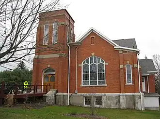 First Presbyterian Church is a historic Presbyterian church located at Spencer in Tioga County, New York. It is a Gothic Revival style, generally rectangular-shaped structure built in 1915. It is constructed of brick with stone trim on a concrete foundation and features a square bell tower at the southwest corner of the building. The interior layout is based upon the Akron plan. It also features 14 stained glass windows designed by Henry Keck of Syracuse, New York.[2]