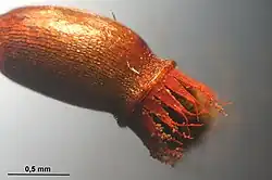 A sporophyte is the diploid multicellular stage in the life cycle of a moss which produces spores. They are commonly observed in this species. There is one sporophyte produced per perichaetium.[4] The seta, which is a stalk that supports capsule, is relatively short and is 25 mm in length. It is red-brown in colour and inserted laterally.[6] The operculum (lid) is about the same length as the rest of the sporangium.[6] The capsule of the sporophyte is inclined, curved, bilaterally symmetric and about 1.5 mm.[4] As for the calyptra, it is cucullate, smooth and about 2.5 mm. [4] The spores are about 3-22 μm.[4]