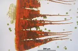 Since it is a member of the Bryopsida class it also has arthrodontous peristome teeth which aid in spore dispersal. Fissidens adianthoides have 16 red teeth. Arthrodontous teeth are made up of cell wall fragments. They are also hygroscopic, meaning they move according to changes in humidity. They are about 85–120 μm wide at the base of the teeth and the upper part of the teeth are finely papillose.[6]