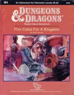 Five Coins for a Kingdom is an adventure module for the Dungeons & Dragons fantasy role-playing game, set in that game's Mystara campaign setting. TSR, Inc. published the module in 1987 for the D&D Master Set rules. It is part of the "M" series of modules. The module was designed by Allen Varney. Its cover art and interior art is by John and Laura Lakey, and cartography by William Reuter.