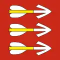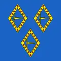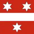 2. In base, gules with three six-pointed stars Or, arranged bendwise.