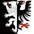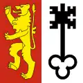 Geneva Coat of arms of Geneva        Per pale: first or, an eagle with two heads dimidiated per pale sable crowned, armed, and beaked gules; second gules, a key paleways or 15th c.