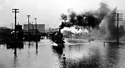 It was also considered the most destructive flood in Grand Rapids history. The Grand River went above bankfull on the night of March 24, rising slowly for the next four days. It broke the previous high-water mark by over 60 cm (2.0 ft), and was considered a once in 100 year flood. Over one-half of the population on the west side of the river was inundated. On the east bank of the river, numerous factories went underwater. There was one casualty. Damages totaled US$1.8 million (1904 dollars). To the left is an image showing the flooding in Battle Creek.[5]