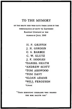 During early 1916, heavy rains caused floods throughout Southern California, virtually cutting off San Diego County from the rest of the state for the greater part of a month.[19] Due to the floods 28 people died and about ten million dollars in damages were caused, with the greatest losses occurring in San Diego County, where twenty-two people died mostly in Otay River valley when the Lower Otay Dam failed, releasing the contents of the Lower Otay Reservoir.[19] Another estimate, was that fifty lives were lost in San Diego County.[20] Among the dead was an early Japanese American colony.[21] San Diego residents blamed the floods on Charles Hatfield who was hired by the city of San Diego to create rain.[22]