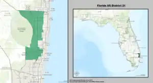Florida's 21st congressional district is a U.S. congressional district on the Treasure Coast. In the 2020 redistricting cycle, the district was drawn as a successor to the previous 18th district and contains all of St. Lucie County and Martin County as well as the northeastern part of Palm Beach County, and includes Port St. Lucie, Fort Pierce, Stuart, Jupiter, and Palm Beach Gardens, as well as Treasure Coast International Airport. The previous iteration of the 21st district, which extended from Delray Beach to Palm Beach, was instead renamed the 22nd district.