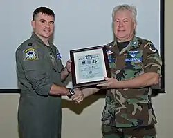 Lt Col John Clark, CAP, Commander of Civil Air Patrol Group 6, presents Capt Scott Morris, USAFR, 93rd Fighter Squadron pilot, with a certificate of appreciation at Homestead Air Reserve Base.