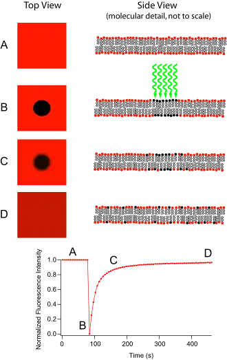 Principle of FRAP A) The bilayer is uniformly labeled with a fluorescent tag B) This label is selectively photobleached by a small (~30 micrometre) fast light pulse C) The intensity within this bleached area is monitored as the bleached dye diffuses out and new dye diffuses in D) Eventually uniform intensity is restored