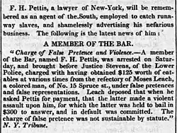 Pettis' later career as a slave catcher took advantage of the nature of fugitive slave laws and in jurisdictional differences in the rights of individuals in various U.S. states.[20] If Pettis got hold of a fugitive slave living in a free state, and could convince a court of that person's identity as escaped chattel, he was empowered to return them to that person's legal owner in a slave state.[21] Thus, even reaching a "free state" like New York was no guarantee of liberty for a freedom-seeking American slave. As a rule, Pettis would advertise in Southern papers, instructing "masters who desired his services...to forward him power of attorney, a description of the runaway, 'and also a fee of $20'."[20] If the slave was to be returned to his or her owner, that would cost an additional $100.[20]