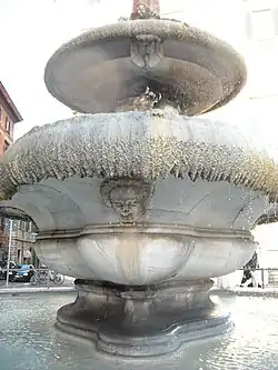 The banister of the fountain, formerly decorated with the coats of arms of the Roman People, was later adorned also with the coat of arm of the Chigi family, to which Pope Alexander VII (1655-1667) belonged: he furthermore added the trimontium, the heraldic symbol of the family, between the putti.