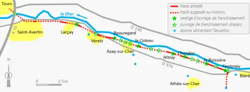 The route of the aqueduct has been identified in six communes on the left bank of the Cher, successively and from east to west, following the slope of the aqueduct: Bléré, Athée-sur-Cher, Azay-sur-Cher, Véretz, Larçay, and Saint-Avertin. The sites where the aqueduct has been identified since the mid-nineteenth century, even if some have been the subject of works leading to the destruction of the remains or have been swept away by natural landslides on the hillside, are sufficiently numerous and geographically close to one another that a large part of the aqueduct's route can be established with a fair degree of precision. Some oral traditions, such as the claim that a castle tower was built on the site of an aqueduct pier, have not been verified.[35]