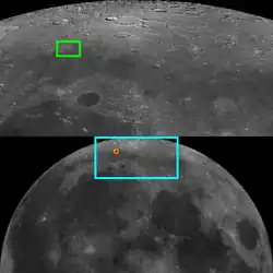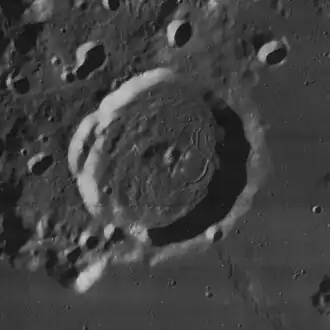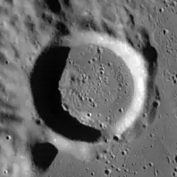 To the east of this crater is an unusual geometric configuration in the surface with an angular shape. This came to be known as "Mädler's Square", after the lunar selenographer Johann Mädler.[2][3] It is roughly square in shape, but appears lozenge-shaped due to foreshortening. This feature was noted in many early books concerning the Moon.