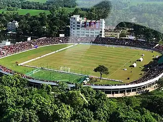 Football is one of the most popular sports in Bangladesh, introduced during the late 19th century under British rule, with Dhaka playing a central role in its development.[1][2] The Bangladesh Football Federation was founded in 1972, a year after the country’s independence. The national team made its official debut at the 1973 Merdeka Cup in Malaysia. Domestic football resumed the same year with the Dhaka First Division League, which had existed since before the partition of India and attracted internationally renowned players like Nasser Hejazi and Emeka Ezeugo. Professional football was introduced in 2007 with the Bangladesh Premier League, known formerly as the B.League.[3]