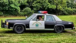 The option package was offered for any sedan trim; while primarily offered on the fleet-oriented S trim, police cars were also offered in the LX trim (including interior carpeting, cloth seats, full wheel covers, and whitewall tires).[12][13] Other options allowed for multiple vehicles to share a common key.[13] The standard engine was the 5.0 L V8, with a 5.8 L V8 (with up to 180 hp) offered as an option; to avoid "gas guzzler" taxes, customers who ordered the 5.8 L engine were required to prove to the IRS that the vehicle was for law enforcement use.[11]