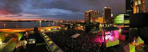 Derived from the nautical, maritime term forecastle, but pronounced as if it were the words "fore" and "castle" joined, Forecastle began as a small, community event in 2002 by JK McKnight at Tyler Park in Louisville. Structured as an equal representation of music, arts, and activism, the event grew quickly and audience expanded regionally. To accommodate increasing crowds, the festival moved to Louisville's larger Cherokee Park in 2005, followed by The Mellwood Arts and Entertainment Center in 2006, Riverfront Plaza/Belvedere in 2007, and Louisville Waterfront Park in 2010. The festival's name, format, and concept were trademarked in 2007.[1] Forecastle was named one of Outside Magazine's "Top 15 Festivals in the Country" in 2009.[4]